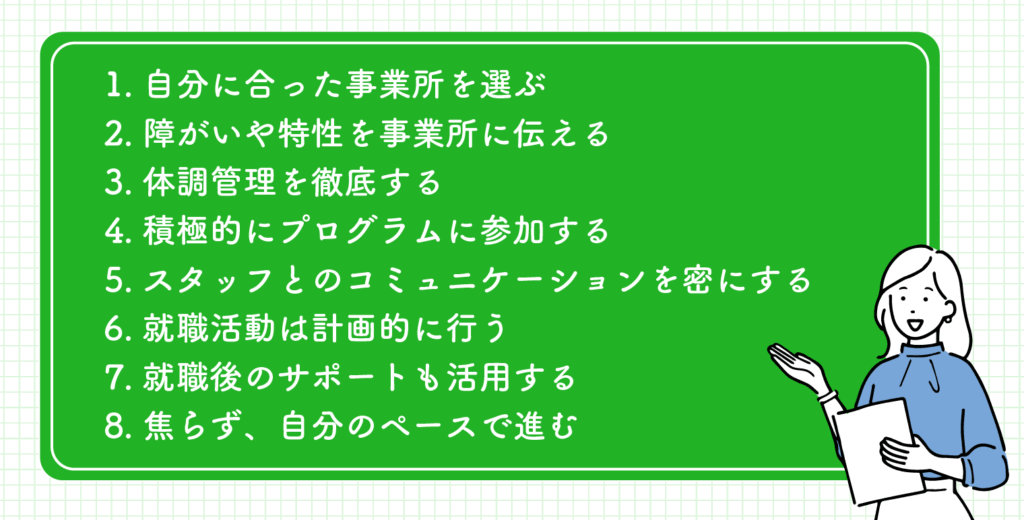 • 自分に合わない場合がある:プログラムや雰囲気が合わない場合は、他の支援サービスを検討しましょう。見学や体験で自分に合う事業所を選ぶことが大切です。