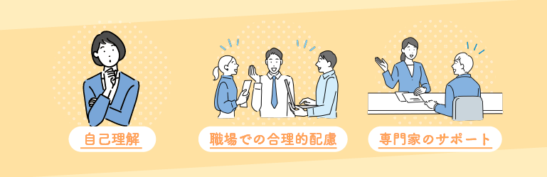 自分の困りごとや特性を上司や同僚に伝えて理解を得ることで、協力を受けやすくなり、相談しやすい関係づくりにもつながります。集中力の維持には適度な休憩や軽い運動も有効で、勤務時間の調整やテレワークの活用など柔軟な働き方も、負担の軽減と働きやすさの向上に役立ちます。