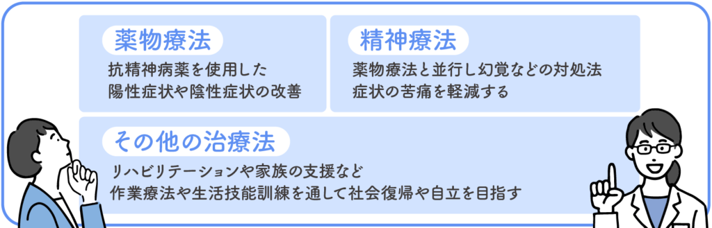 陽性症状の治療には、主に抗精神病薬が用いられます。これらの薬は、脳内のドーパミンの働きを抑制し、幻覚や妄想などの症状を緩和します。また、精神療法も症状の改善に役立ちます。