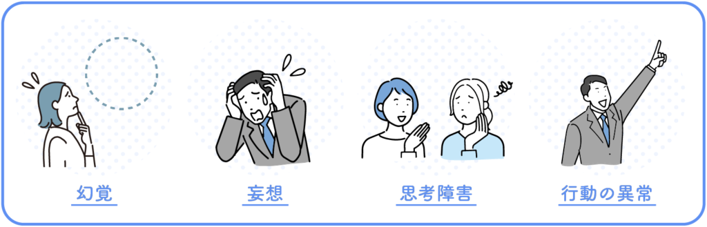 陽性症状とは、通常は存在しないものが現れる症状のことです。統合失調症の陽性症状には、主に以下のものがあります。