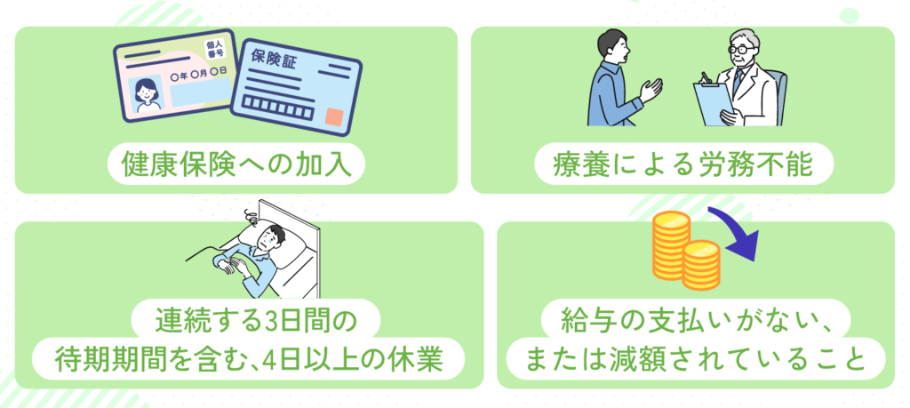 傷病手当金を受給するには、以下の4つの条件すべてを満たす必要があります。